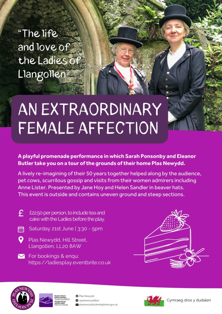 Our most thrilling show is our promenade performance as the Ladies of Llangollen in the grounds of Plas Newydd, where the ladies lived 200 years ago! We performed this show in 2024 to a very appreciative audience and now we’re delighted to be back again on 21 June 2025.