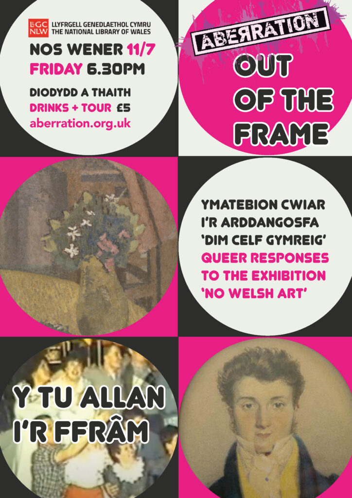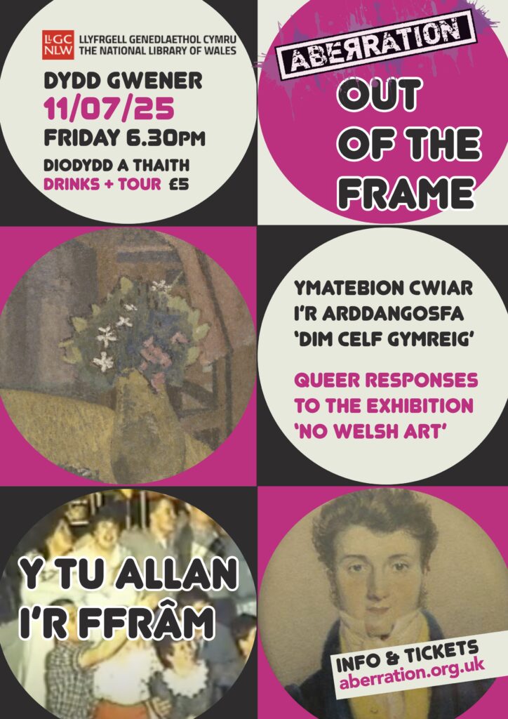 Friday 11 July 6.30pm Aberration presents OUT OF THE FRAME: Queer Responses to the Exhibition ‘No Welsh Art’, National Library, Aberystwyth. An exciting evening where we take over the gallery and hear from LGBTQ+ artists and writers.INFO>>